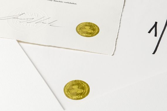 - Per ogni edizione è stato rilasciato un certificato con un numero di ologramma in cui sono riportate tutte le informazioni relative all’edizione (nome dell’opera originale, grandezza, anno, data di stampa, …).